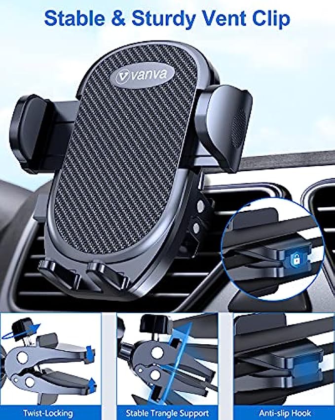 • [ vanva Ultimate Car Phone Holder ] With the latest improved vent clip [Don't Slip & Drop], this car phone holder could hold your phone firmly even on the bumpiest road or sharper turn. This phone car holder is made from the most advanced durable sturdy aviation-grade materials,it is the first phone mount car to pass most extreme test on the market, making it more resistant to abrasion and corrosion.