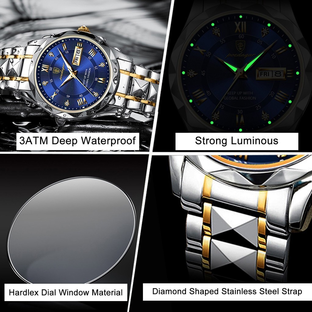[With Box]POSHI Fashion Business Stainless Steel Luxury Mens Gold Watch Luminous Waterproof Automatic Date Swiss Quartz Wrist Watch for Men